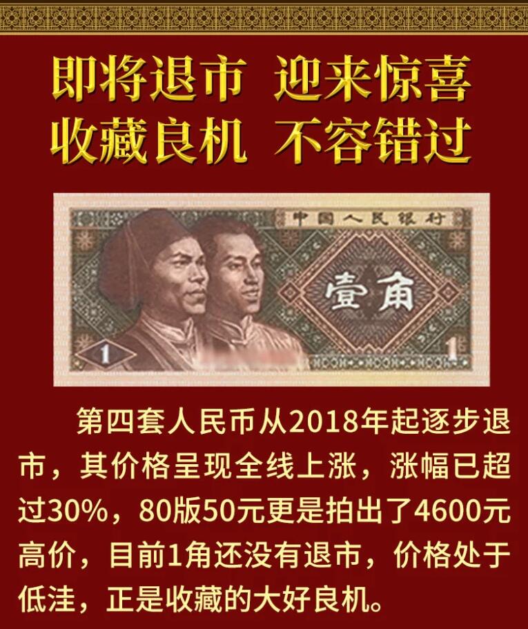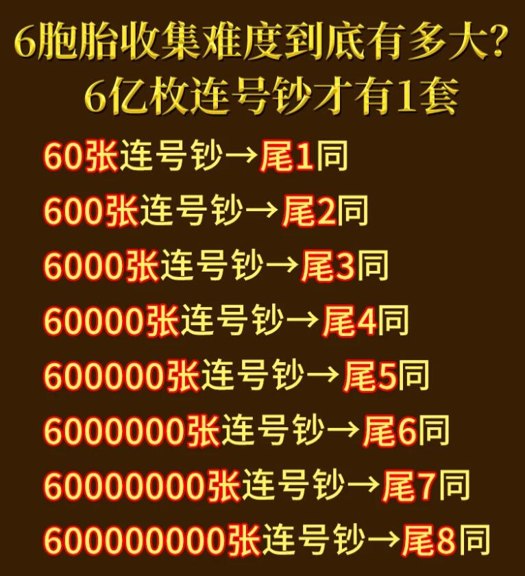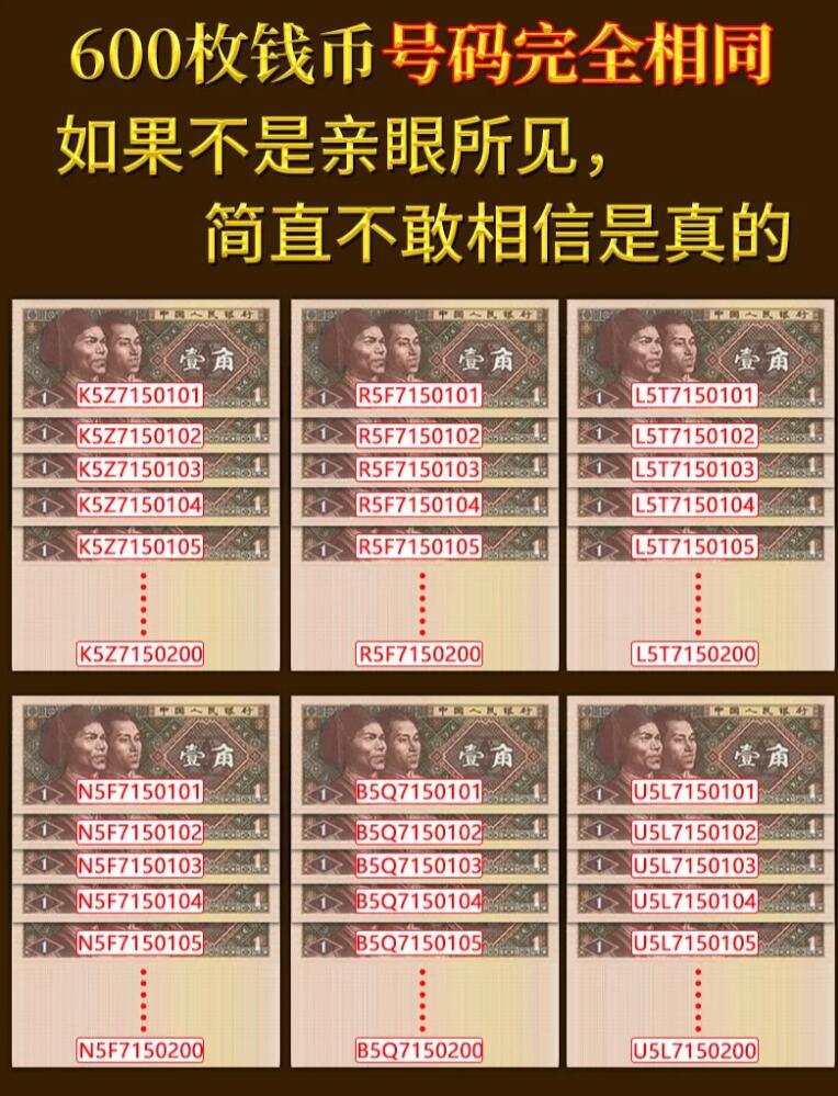 《壹號財富》包含第四套80版壹角6組共計600枚,每組錢幣是號碼相連的百連號,6組錢幣號碼完全同號相連。第四套角幣從2004年開始只收不付,至今95%已被銷毀,這種“全同號+百連號”的六胞胎組合,收藏難度遠超單張或普通連號鈔,堪稱“中的”!