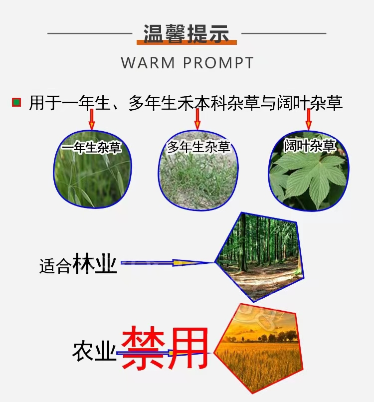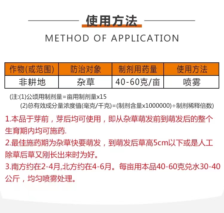 使用劑量:防除一年生雜草每畝使用50克,防除多年生雜草及灌木,每畝用量需提高到100-200克。