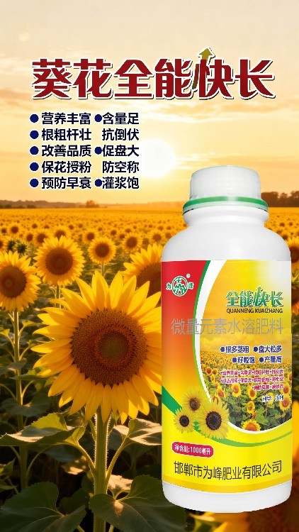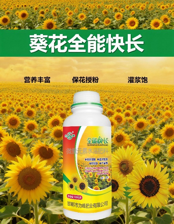 葵花授粉好不好,直接影響結(jié)籽率。全能快長特別添加硼等關(guān)鍵元素,能改善花粉活力,促進(jìn)授粉過程,減少空殼癟粒,幫助葵花盤膨大、籽粒飽滿。產(chǎn)品還能增強(qiáng)作物抗病抗逆能力,應(yīng)對不良?xì)夂?。廠家為峰肥業(yè)誠邀農(nóng)資伙伴合作推廣這款多元素葉面肥,攜手助農(nóng)增產(chǎn)!