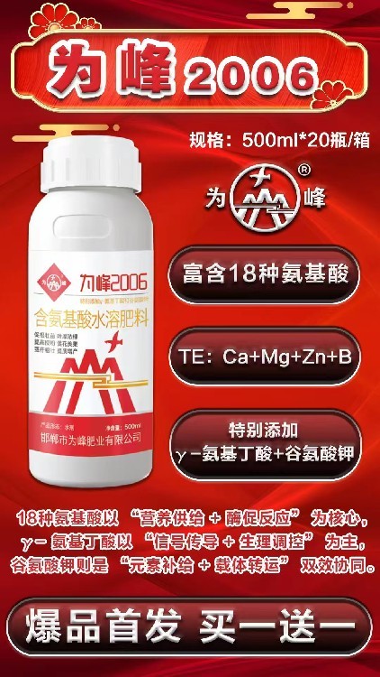 為峰2006,由農(nóng)業(yè)技術(shù)員主導(dǎo)研發(fā)的作物營(yíng)養(yǎng)制劑,聚焦作物營(yíng)養(yǎng)短板,融合四大核心成分,滿足作物生長(zhǎng)全周期需求。18種氨基酸提供充足營(yíng)養(yǎng),小分子易吸收,快速激活生長(zhǎng)潛能,促進(jìn)根系發(fā)達(dá)、莖葉繁茂,提升光合效率、積累營(yíng)養(yǎng)、助力高產(chǎn)。鈣鎂鋅硼協(xié)同作用,彌補(bǔ)土壤養(yǎng)分,鈣強(qiáng)細(xì)胞壁、減裂果軟果,鎂保光合、改黃葉,鋅硼促授粉、減落花落果、提品質(zhì)。谷氨酸鉀補(bǔ)有機(jī)氮、降硝酸鹽、提品質(zhì)、抗旱促苗,氨基丁酸增強(qiáng)抗逆性、應(yīng)對(duì)不良環(huán)境、減農(nóng)藥使用。本品綠色安全、操作便捷,適配各類作物,助力農(nóng)戶節(jié)本增效、豐產(chǎn)增收。?