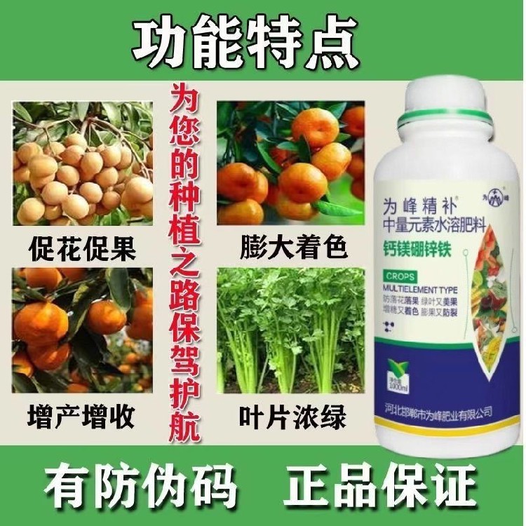 為峰精補鈣鎂硼鋅鐵,協(xié)同發(fā)力提升光合作用,促進花芽分化與花果發(fā)育,實現(xiàn)作物全程優(yōu)質(zhì)生長。鎂元素作為葉綠素關(guān)鍵成分,能快速改善葉片發(fā)黃、長勢衰弱問題,顯著提升光合利用率,促進養(yǎng)分轉(zhuǎn)化與積累,為花芽分化和作物生長提供充足能量;硼元素精準(zhǔn)調(diào)控花芽分化,促進花芽飽滿、花期整齊,減少畸形花芽,提高坐果潛力;鈣元素強化植株細(xì)胞壁,增強植株韌性,鋅鐵補充微量元素,改善植株長勢,增強抗逆能力。多種元素科學(xué)配比、協(xié)同作用,既能解決作物光合不足、花芽分化差的問題,又能提升植株整體長勢,減少落花落蕾,為后續(xù)?;ū9?、果實膨大奠定基礎(chǔ),適配各類經(jīng)濟作物與糧食作物,助力種植戶輕松實現(xiàn)苗期壯、花期齊、果期優(yōu)的種植目標(biāo)。?