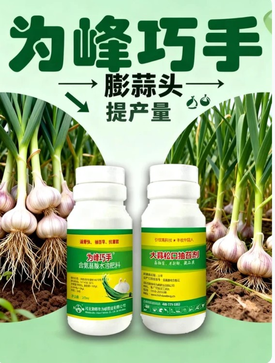 為峰巧手大蒜松口抽苔劑,整合多重核心功效,以生根壯苗為基礎(chǔ),提速返青進(jìn)程,全方位防控黃葉、干尖、死苗、爛根等常見病害,同時推動抽苔早熟、蒜頭膨大,全面提升大蒜品質(zhì)。使用后可快速滲透大蒜根系,刺激根系快速生長,增強(qiáng)根系活力與抗逆能力,培育健壯蒜苗,加速返青,讓蒜苗快速恢復(fù)長勢、葉片翠綠肥厚。通過補(bǔ)充微量元素與抗菌成分,有效抑制黃葉干尖滋生,預(yù)防死苗爛根,保障植株健康生長??纱偈勾笏獬樘r間提前,軟化蒜薹基部,實現(xiàn)輕松抽苔、不折不斷,后期定向輸送養(yǎng)分至蒜頭,加速蒜頭細(xì)胞膨大,減少畸形蒜、空心蒜,提升蒜頭飽滿度與商品品質(zhì),實現(xiàn)早熟、豐產(chǎn)、優(yōu)產(chǎn)三者兼顧。