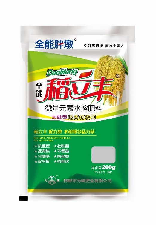稻立豐,是河北邯鄲為峰肥業(yè)科研團(tuán)隊(duì),根據(jù)水稻的生長(zhǎng)習(xí)性,經(jīng)多年的研發(fā)實(shí)驗(yàn)而精心制造的水稻肥。 1、壯苗、抗倒。本品稻立豐內(nèi)含水稻生長(zhǎng)所必需的多種營(yíng)養(yǎng)元素,噴施后返青早、返青快、矮壯抗倒。葉面光合作用增強(qiáng),苗強(qiáng)苗,植物生長(zhǎng)健壯,葉面嫩綠肥厚。 2、 抽穗齊、灌漿足。本品稻立豐富含多種營(yíng)養(yǎng)元素配比合理,養(yǎng)分全。含量足,養(yǎng)分易吸收,見(jiàn)效快,利用率高,肥效持久,能滿(mǎn)足水稻全生育期對(duì)各種營(yíng)養(yǎng)的需求。使用后,作物抽穗齊、灌漿足,提高千粒重。 3、 抗旱、抗寒、抗病。本品稻立豐內(nèi)含多種有益生物菌和抗病生物蛋白酶,具有分素,緩解肥害,改良鹽堿,抑制病苗等功能。噴施后可促進(jìn)小穗小花發(fā)育,增加顆粒數(shù)和千粒重、、抗干熱風(fēng)。 4、 籽大粒飽,增產(chǎn)豐收。本品稻立豐用后可增強(qiáng)水稻的光合能力,促進(jìn)籽粒干物質(zhì)的積累,增加千粒重,籽大粒飽,增產(chǎn)增收。促進(jìn)灌漿結(jié)實(shí),減少空秕籽率。增加水稻蛋白質(zhì)的含量,質(zhì)優(yōu)。