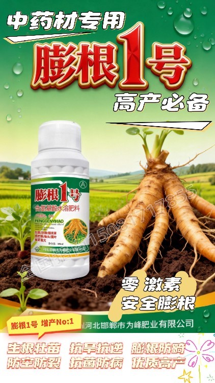 中藥材種植如何突破產(chǎn)量瓶頸?為峰肥業(yè)【膨根一號】給出解決方案!這款藥材膨大素專為根莖類作物研發(fā),富含氨基酸與鈣鎂元素,能有效促進根系發(fā)育,提升吸收能力。噴施后葉片濃綠厚實,莖稈粗壯,光合產(chǎn)物向根部高效轉(zhuǎn)移,實現(xiàn)膨大增產(chǎn)。特別適合在關(guān)鍵生長期使用,效果顯著。預(yù)防缺素、死苗、早衰等問題,提升植株健康度。作為正規(guī)廠家產(chǎn)品,深受種植戶信賴?,F(xiàn)面向全國招商,歡迎咨詢合作。選擇為峰肥業(yè),就是選擇高效與安心!
