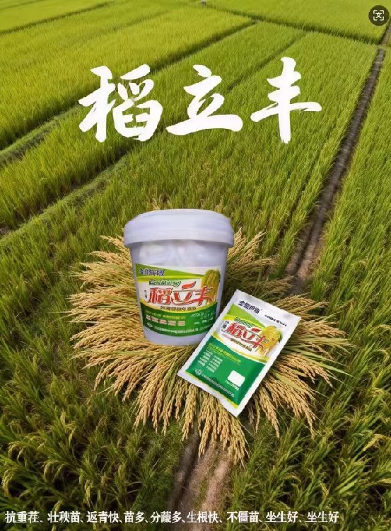 "全能稻立豐”是水稻返青柯權(quán)專用肥,具有固氮、解磷、補(bǔ)鉀、補(bǔ)硅等功效,全面均衡的補(bǔ)充作物生長(zhǎng)所需營(yíng)養(yǎng),同時(shí)添加土壤江化菌。使用本品稻立豐后發(fā)根快、根群大、根毛多、返苗快、分蘗(柯杈)多、莖桿粗壯、成穗率高,促進(jìn)水稻生長(zhǎng),使籽粒飽滿,成熟時(shí)青枝蠟桿,產(chǎn)量高。還可以預(yù)防僵苗、 坐蔸小葉、黃葉、矮縮等癥。提高水稻對(duì)低溫凍害、澇害、鹽堿等不良環(huán)境的抵抗能力?;罹煞帜苊黠@改善土壤,抵抗有害病菌,須防多種病害發(fā)生,同時(shí)提高地溫,活化土壤,提高水稻免疫力。易成穗,抽穗早,穗多粒大,灌漿加快,籽粒飽滿。 產(chǎn)品功效: 速效:迅速促進(jìn)根系發(fā)達(dá)、返青快、促分蘗、好增產(chǎn)。 持久:一畝一包,補(bǔ)充鋅硅等多種微量元素,提高水稻對(duì)大量元素利用率。 矮壯抗倒伏:苗齊苗壯、改善水稻品質(zhì)??共×?qiáng),抗倒伏。 施用方法:在水稻移栽5- 7天活蔸后(直播田在分蘗始期), 每畝用尿素8 10公斤加入本品200克( 1袋), 攪拌均勻后撒施。