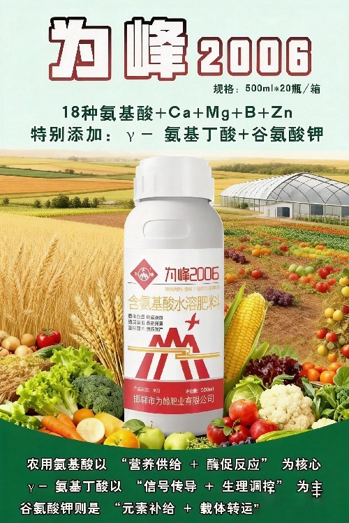 “為峰2006”是深度理解植物生理與營(yíng)養(yǎng)學(xué)原理的科技成果。它不是簡(jiǎn)單堆砌成分,而是講究協(xié)同作用的科學(xué)配方:18種氨基酸模擬植物內(nèi)源需求;中微量元素以氨基酸螯合態(tài)保持高活性;谷氨酸鉀提供有機(jī)鉀源,促進(jìn)氨基酸代謝與運(yùn)輸;氨基丁酸作為信號(hào)分子,調(diào)控抗逆與生長(zhǎng)。每一處設(shè)計(jì)都蘊(yùn)含著對(duì)作物生命規(guī)律的尊重與利用。選擇“為峰2006”,就是選擇了一套經(jīng)過深思熟慮的、高效的植物營(yíng)養(yǎng)與健康管理方案。