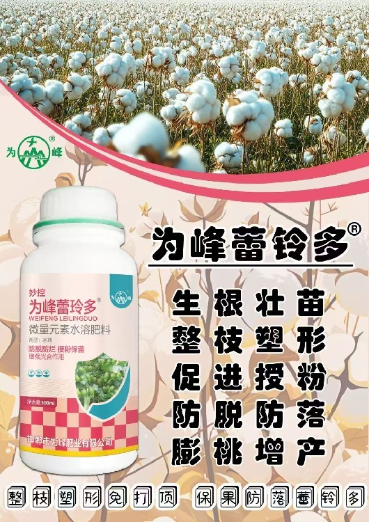 葉面噴施為峰蕾鈴多可促進(jìn)養(yǎng)分吸收、轉(zhuǎn)移,提高光合效率。增加座桃率,保花、保桃,促進(jìn)棉花桃大絨長(zhǎng),吐絮早,品質(zhì)好。并能防止落桃、爛桃,有效防止植株早衰、貪青晚熟,刺激后期棉桃早吐絮,增加優(yōu)質(zhì)棉產(chǎn)量。對(duì)低溫、潮濕引起的根系生長(zhǎng)緩慢、吸收功能下降可起到補(bǔ)充營(yíng)養(yǎng)、促進(jìn)根系快速再生的效果。