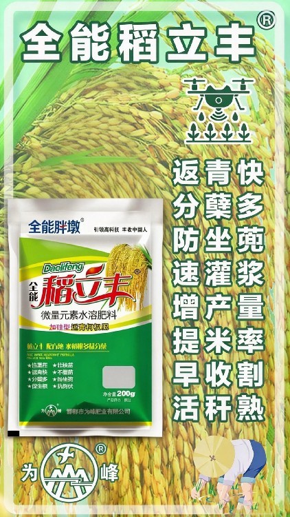 稻立豐,是河北邯鄲為峰肥業(yè)科研團(tuán)隊(duì),根據(jù)水稻的生長習(xí)性,經(jīng)多年的研發(fā)實(shí)驗(yàn)而精心制造的水稻肥。 1、壯苗、抗倒。本品稻立豐內(nèi)含水稻生長所必需的多種營養(yǎng)元素,噴施后返青早、返青快、矮壯抗倒。葉面光合作用增強(qiáng),苗強(qiáng)苗,植物生長健壯,葉面嫩綠肥厚。 2、 抽穗齊、灌漿足。本品稻立豐富含多種營養(yǎng)元素配比合理,養(yǎng)分全。含量足,養(yǎng)分易吸收,見效快,利用率高,肥效持久,能滿足水稻全生育期對各種營養(yǎng)的需求。使用后,作物抽穗齊、灌漿足,提高千粒重。 3、 抗旱、抗寒、抗病。本品稻立豐內(nèi)含多種有益生物菌和抗病生物蛋白酶,具有分素,緩解肥害,改良鹽堿,抑制病苗等功能。噴施后可促進(jìn)小穗小花發(fā)育,增加顆粒數(shù)和千粒重、、抗干熱風(fēng)。 4、 籽大粒飽,增產(chǎn)豐收。本品稻立豐用后可增強(qiáng)水稻的光合能力,促進(jìn)籽粒干物質(zhì)的積累,增加千粒重,籽大粒飽,增產(chǎn)增收。促進(jìn)灌漿結(jié)實(shí),減少空秕籽率。增加水稻蛋白質(zhì)的含量,質(zhì)優(yōu)。