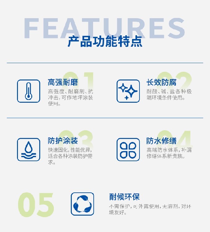單組分聚脲施工時(shí),對(duì)于基層材料的浸潤(rùn)時(shí)間長(zhǎng),這給對(duì)于基層的粘結(jié)性帶來(lái)益處,且其粘接強(qiáng)度和剝離強(qiáng)度非常高,尤其在長(zhǎng)期浸泡水粘結(jié)方面,為耐久性最長(zhǎng)的彈性涂膜材料之一;特別的其在低溫-45℃條件下仍可保持50-100%以上的斷裂伸長(zhǎng)率,說(shuō)明其在低溫零下-45℃的極其嚴(yán)寒的條件下,仍保持彈性體特征。 其在水利水電、新能源、鐵路、交通、建筑、市政、電力、海工、船舶、航空、航天、地下工程、采礦、機(jī)械、化工等行業(yè)的建(構(gòu))筑物面層防護(hù)(防腐、防水、抗沖耐磨)有良好的用途;在長(zhǎng)期泡水、室外耐候、高低溫氣候交變等嚴(yán)酷條件下具有超長(zhǎng)的耐久性,是目前為止,室外、泡水工程和戶外耐候彈性體中耐久性最長(zhǎng)的彈性體材料之一。