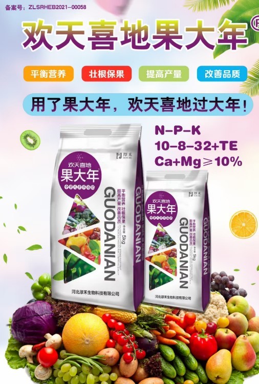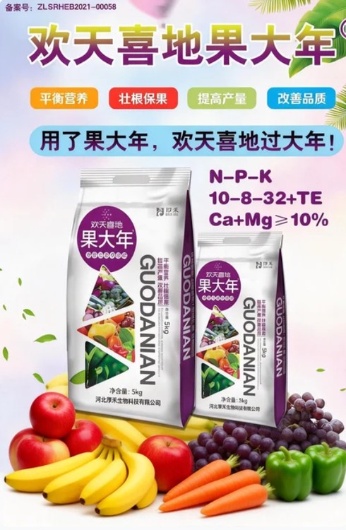 歡天喜地果大年是瓜果、果樹、蔬菜專用肥,生根壯苗為核心,快速改善根系生長環(huán)境,促根下扎、根系發(fā)達(dá),讓苗株長勢(shì)旺盛,吸收水肥能力翻倍。高效促進(jìn)授粉,解決低溫、寡照等導(dǎo)致的授粉不良問題,?;ū9咝В蠓岣咦?。膨果期快速輸送養(yǎng)分,推動(dòng)果實(shí)均勻膨大,果個(gè)更大更均勻,同時(shí)美果靚果,提亮果色、優(yōu)化果形,減少裂果、畸形果,讓果蔬品相佳、口感好,助力農(nóng)戶實(shí)現(xiàn)豐產(chǎn)優(yōu)收。