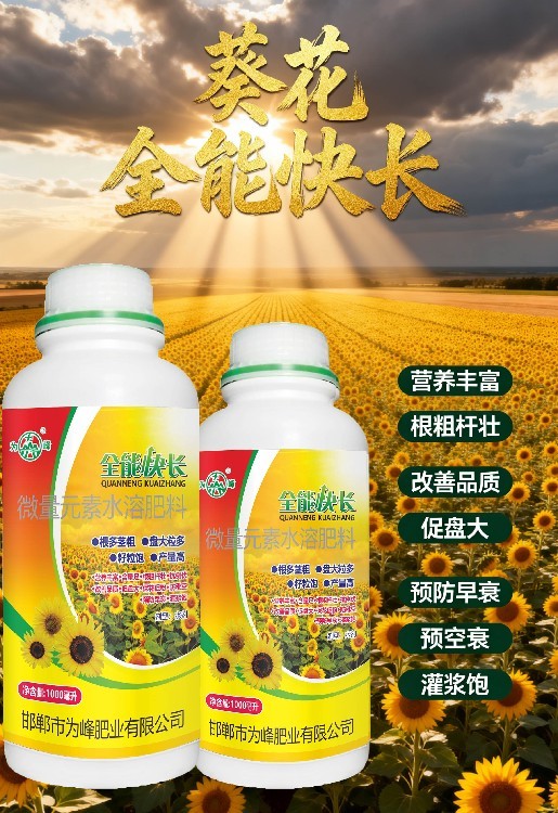 后期早衰會導(dǎo)致葵花灌漿不足、籽粒不飽滿。全能快長能有效調(diào)節(jié)植株碳氮平衡,促進干物質(zhì)積累,防止功能葉早衰,延長籽粒充實時間,從而實現(xiàn)增產(chǎn)提質(zhì)。為峰肥業(yè)致力于研發(fā)高效農(nóng)資產(chǎn)品,本款葵花專用葉面肥效果顯著?,F(xiàn)面向全國招商,歡迎有志之士加入!