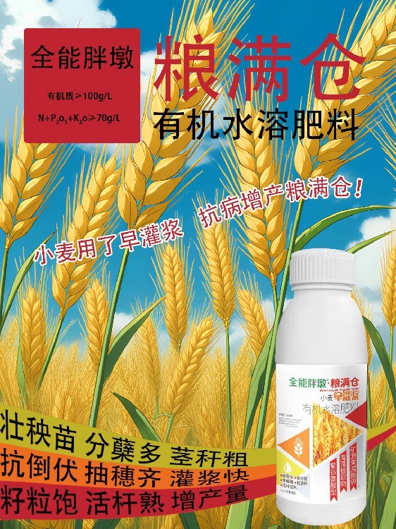 拔節(jié)期管理核心:壯稈增穗看這里, 小麥拔節(jié)期是決定穗數(shù)和稈強的關鍵階段。此時使用為峰肥業(yè)的麥黃金,能加速光合產(chǎn)物積累,促進幼穗分化,提高有效穗數(shù),同時讓莖稈拔節(jié)粗壯,為后續(xù)抗倒伏和灌漿打下堅實基礎。抓住關鍵期,精準補充營養(yǎng),實現(xiàn)“穗多稈壯”的豐收景象。拔節(jié)期管理,別忘了這款小麥增產(chǎn)肥料。
