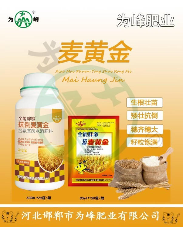 告別倒伏焦慮!小麥“壯稈”新選擇, 小麥拔節(jié)后最怕風(fēng)雨倒伏?為峰肥業(yè)潛心研發(fā)的麥黃金,為您的小麥筑牢抗倒防線!這款全能型小麥增產(chǎn)葉面肥富含氨基酸與中微量元素,能促進(jìn)莖稈細(xì)胞壁加厚、節(jié)間縮短,使植株矮壯挺拔。返青期開始使用,讓根系深扎、莖稈粗壯如“小胖墩”,抗風(fēng)抗雨能力顯著提升。豐收的基礎(chǔ)是站得穩(wěn),選擇為峰肥業(yè)麥黃金,讓您的麥田從容應(yīng)對(duì)惡劣天氣!歡迎撥打招商電話了解詳情。