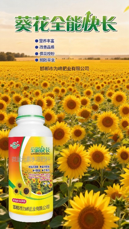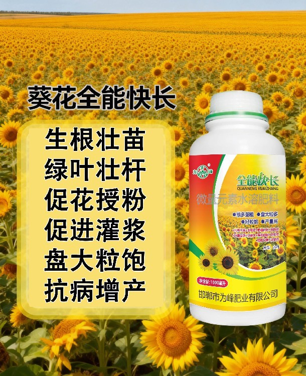 葵花種植,每個(gè)階段都關(guān)鍵!全能快長根據(jù)向日葵不同生長期調(diào)整使用濃度,苗期促根提苗,枝葉期壯稈促葉,初花期助力授粉膨粒。產(chǎn)品能顯著改善因缺素引起的黃葉、小葉等現(xiàn)象,增強(qiáng)植株活力。廠家為峰肥業(yè)依托科技實(shí)力,為您提供專業(yè)的多元素葉面肥解決方案。招商合作持續(xù)進(jìn)行中,歡迎咨詢!