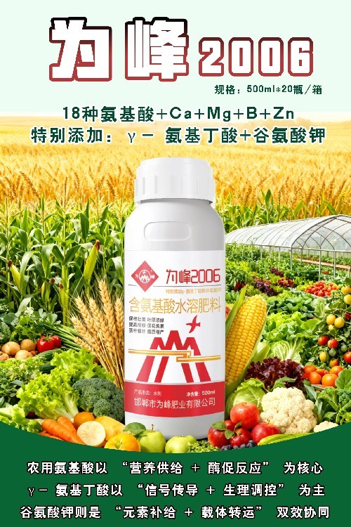 面對干旱、低溫、鹽堿等逆境挑戰(zhàn),為峰2006特別添加的γ-氨基丁酸(GABA)能顯著增強(qiáng)作物自身抗逆性,調(diào)節(jié)生理代謝,幫助作物在不良環(huán)境中保持正常生長,減少損失。為峰肥業(yè)致力于為種植戶排憂解難。廠家直供,品質(zhì)保證,歡迎實(shí)力伙伴洽談?wù)猩毯献鳌?br/>