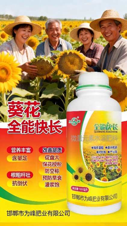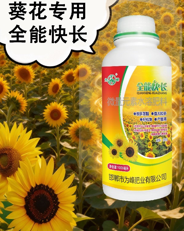 為峰肥業(yè)【全能快長(zhǎng)】——讓葵花更燦爛,讓收獲更豐盛!這款葵花快長(zhǎng)葉面肥富含多種中微量元素,特別添加進(jìn)口活性助劑,能顯著提高作物抗逆能力。噴施后根系發(fā)達(dá),莖稈粗壯,葉片肥厚油綠。有效促進(jìn)干物質(zhì)累積,為籽粒飽滿(mǎn)奠定基礎(chǔ)。特別有助于提高授粉效率,實(shí)現(xiàn)盤(pán)大粒多。作為多元素葉面肥的優(yōu)選,深受種植戶(hù)好評(píng)。廠(chǎng)家直銷(xiāo),支持代理合作。歡迎咨詢(xún)招商政策,共謀發(fā)展!