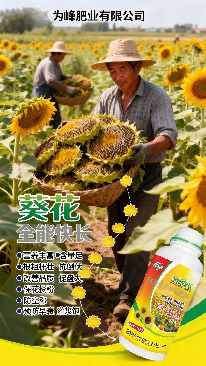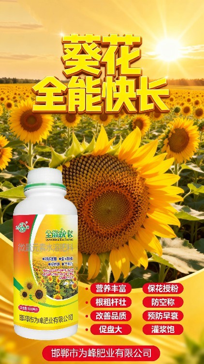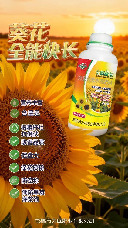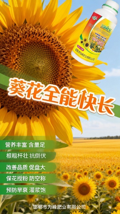 想讓葵花盤大粒多、籽粒飽滿?試試全能快長——葵花專用葉面肥!本品針對向日葵各階段需求科學(xué)配比,富含銅、鋅、硼等多種中微量元素,配合進(jìn)口助劑,有效促根壯苗、提升抗逆。使用后葉片油綠肥厚,莖稈粗壯有力,花粉質(zhì)量改善,授粉更充分。為峰肥業(yè)專注作物營養(yǎng),誠邀合作伙伴攜手推廣這款多元素葉面肥,共贏葵花豐收市場!