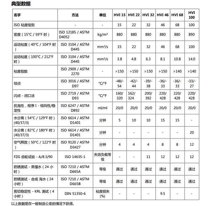 Hyspin HVI 級別符合以下標(biāo)準(zhǔn)的要求: DIN 51524 第 3 部分 Cincinnati Lamb (Milacron) P 68-69-70 Denison (Parker Hannafin) HF-0 US Steel 126 & 127 Eaton I-286-S & M-2950-S Frank Mohn
