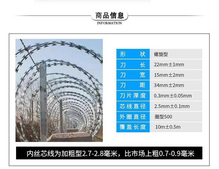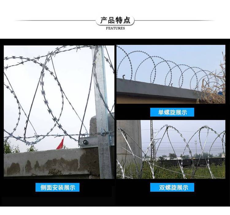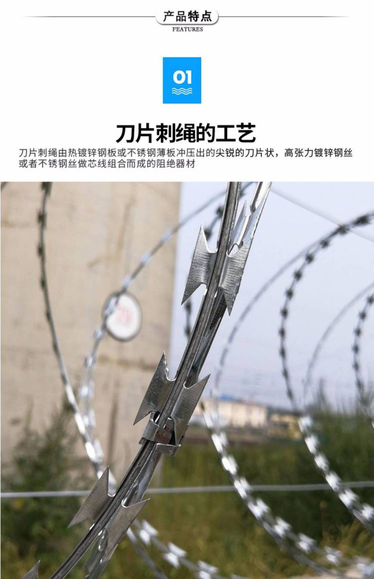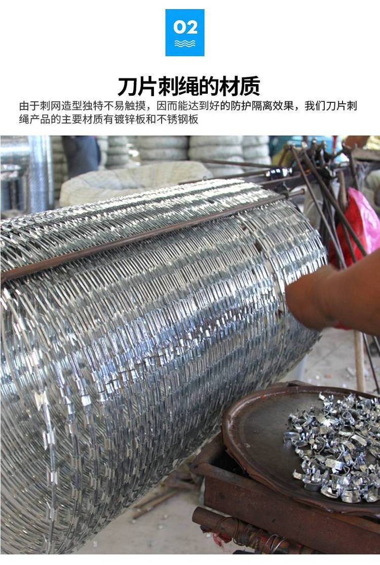 刀片刺繩一般用于做防護(hù)用,因刀片鋒利不易觸摸,起到一定的嚇阻作用那個(gè),